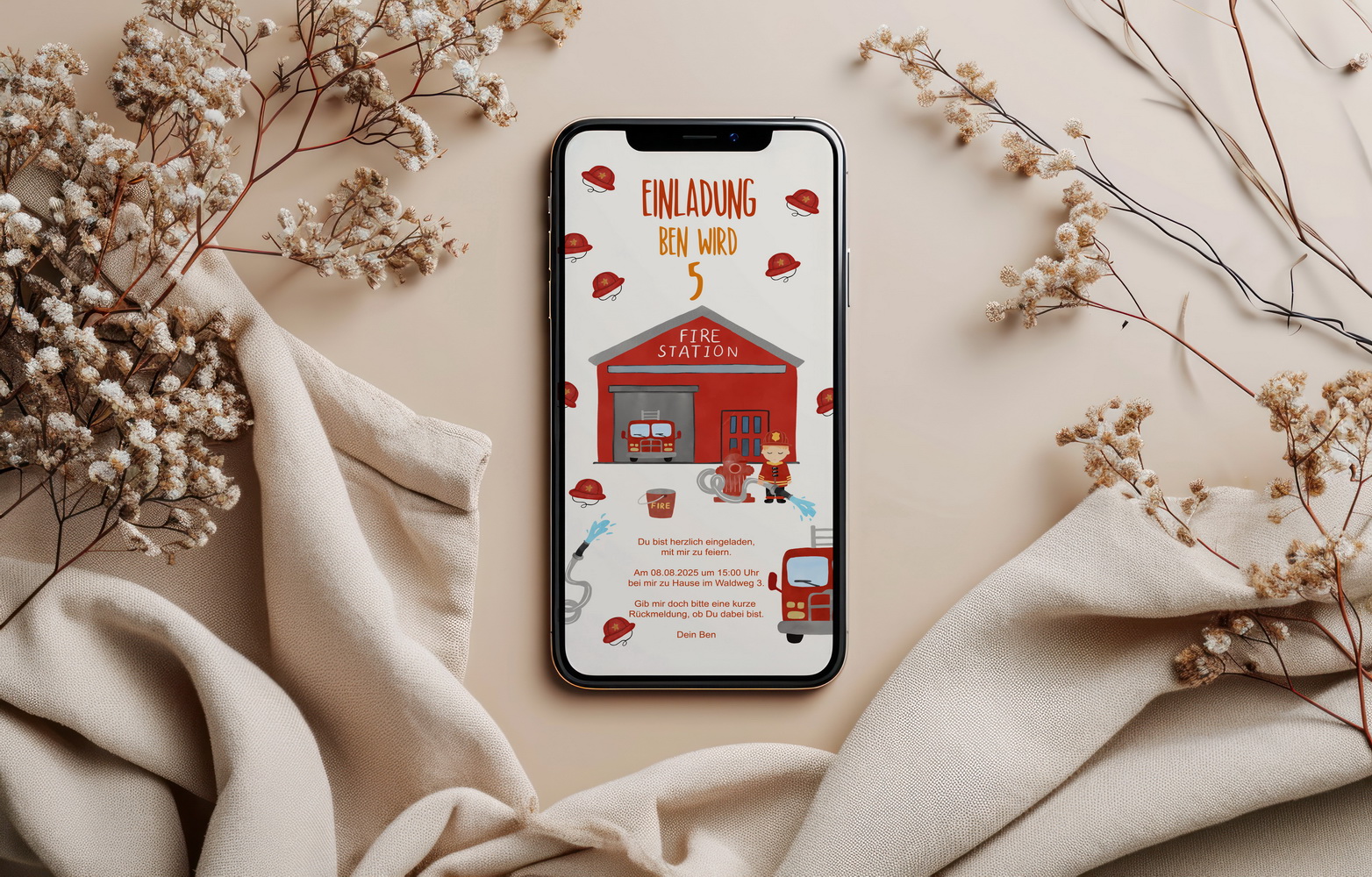 BENBINO Serie Feuerwehr | digitale Einladung Smartphone (Fire Station) – personalisierbar