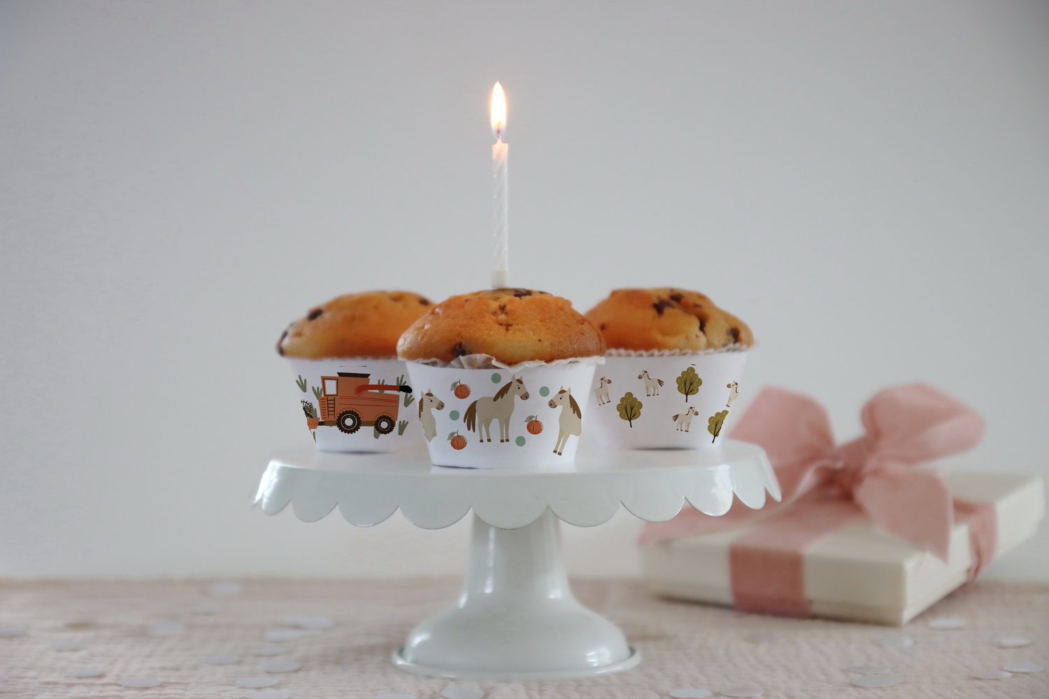 Niedliche Muffin-Banderolen in 3 verschiedenen Designs (s. Vorschau) aus unserer Serie PFERDE für Euren Kindergeburtstag. Liebevolle, unaufdringliche Dekorationen. In diese hübschen Banderolen kannst Du Muffins oder Cupcakes mit ihren Backförmchen stecken und schon passen sie sich perfekt an Deine Tischdeko an.