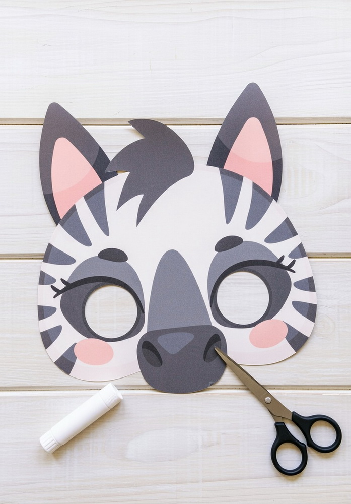 Mit diesem Set erhältst Du sechs Tiermasken zum Selbstausdrucken: Leopard, Zebra, Elefant, Panda, Bär, Nilpferd.